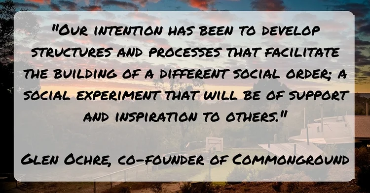 To provide a conference and retreat venue for the social change movement at the Commonground property, in the bush near Seymour in Central Victoria.