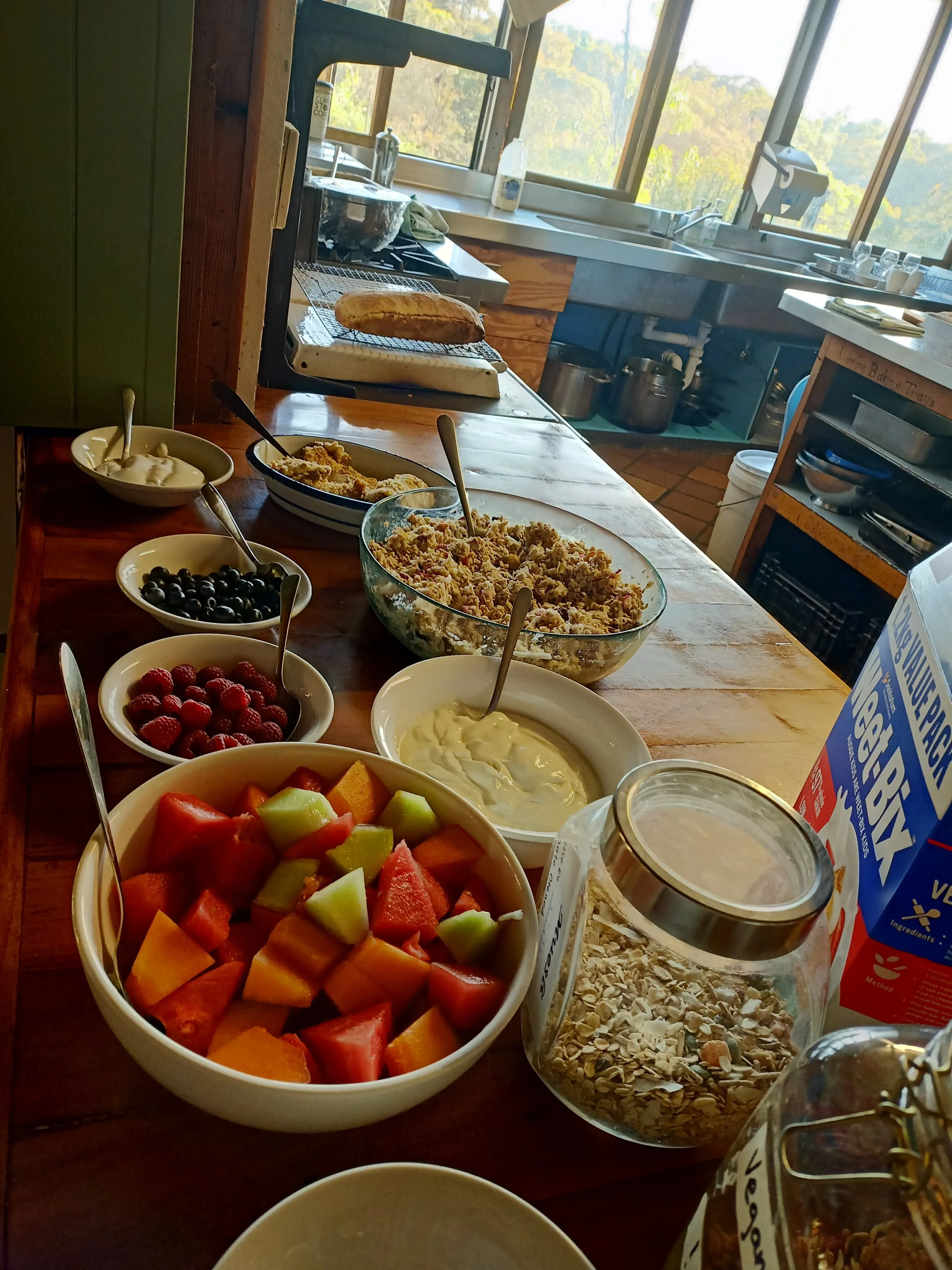 Self serve continental breakfast with toast, cereal, fresh Bircher muesli, home made pasties, yogurt, and seasonal fruits.
